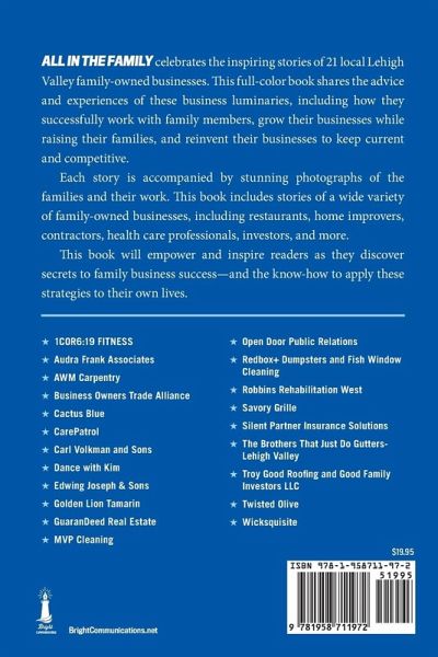 ALL IN THE FAMILY celebrates the inspiring stories of 21 local Lehigh Valley family-owned businesses. Thi full-color book shares the advice and experiences of these business luminaries, including how they successfully work with family members, grow their businesses while raising their families, and reinvent their businesses to keep current and competitive. Each story is accompanied by stunning photographs of the families and their work. This book includes stories of a wide variety of family-owned businesses, including restaurants, home improvers, contractors, health care professionals, investors, and more. This book will empower and inspire readers as they discover secrets to family business success-and the know-how to apply these strategies to their own lives.