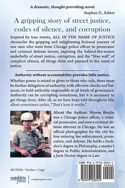 Dear Friends,You ask, "Who may benefit from reading your book, ALL IN THE NAME OF JUSTICE?" Truly everyone will. It is a brutally honest and gripping story that will hold a reader's interest as the main character journeys through his occupational revelations as a Chicago police officer, Cook County prosecutor, and criminal defense attorney in Chicago and Miami, a journey inspired by true events and experiences of the author, Warren J. Breslin.More specifically and pointedly, however, all police officers, lawyers, and judges will identify with the life adventures of Jack Keegan, the lead character, as he reminisces of those life adventures during jury deliberation in a murder trial of his client, a major and ruthless cartel drug dealer who rose through the ranks from a street corner in Chicago to a drug cartel major distributor throughout Mexico, Miami, and Chicago. All readers will come to understand the inescapable human frailties and stress in the job of being a police officer-especially of being a police officer-and of being a lawyer, a judge, and any other occupational positions of authority.The book is not preachy. It is not a roadmap to good governance. But it does stress the importance for public understanding of authority with realistic measures to monitor and assure compliance-and with reasonable rules so that authority may be exercised effectively. The rules should be fair to all, without overlooking fairness to the authority figures themselves who must be allowed to do their jobs.ALL IN THE NAME OF JUSTICE stands out from the monotonous and unfair, ill-serving writings and video media coverage of police officers and other authority figures abusing their powers without equal emphasis on the failures of the public to orderly comply with authoritarian directives necessary to preserve social order. It's a good "on-the-edge-of-your-seat" story, with or without a message, that I am sure you will enjoy. Warren J. Breslin