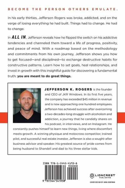 Become the person others emulate. In his early thirties, Jefferson Rogers was broke, addicted, and on the verge of losing everything he had built. Things had to change. He had to change. ¿ In ALL IN, Jefferson reveals how he flipped the switch on his addictive tendencies and channeled them toward a life of progress, positivity, and peace of mind. With a roadmap based on the methodology and commitments from his own journey, Jefferson shows you how to get focused-and disciplined-to exchange destructive habits for constructive patterns. Learn how to set goals, heal relationships, and invest in growth with this insightful guide for discovering a fundamental truth: you are meant to do great things.