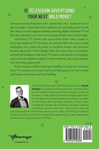 IS TELEVISION ADVERTISING YOUR NEXT BOLD MOVE? Americans are watching more video content than ever-nearly six hours a day on average. A closer look at how audiences are consuming content reveals that video is a broad category including streaming, digital, and linear TV and that these alternatives are much more integrated than many acknowledge. All-Inclusive TV reframes the conversation about video content to prove that traditional TV inventory not only fits within the current media marketplace but retains the power to transform brands and businesses beyond expectation. Chuck Hengel shows how data science, automation, and artificial intelligence help linear TV measure and optimize ad campaigns, achieve the accountability sought by modern marketers, and create a targeted, rich advertising opportunity. If you're trying to build a brand, gain visibility, or attract new customers, linear TV continues to be a smart bet for the big impact it can have on both performance marketing and brand building.