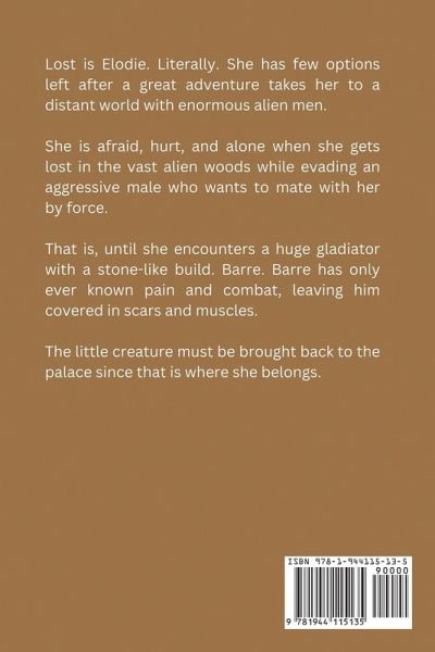 Lost is Elodie. Literally. She has few options left after a great adventure takes her to a distant world with enormous alien men. She is afraid, hurt, and alone when she gets lost in the vast alien woods while evading an aggressive male who wants to mate with her by force. That is, until she encounters a huge gladiator with a stone-like build. Barre. Barre has only ever known pain and combat, leaving him covered in scars and muscles. Although he is the most powerful being on the world, he avoids public view. He takes pleasure in his silence and seclusion. Although he is fond of the young girl he discovers in the woods and hasn't seen a woman in years, he is unable to retain her for himself. The little creature must be brought back to the palace since that is where she belongs.