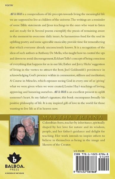 All Is Well is a compendium of life precepts towards living the meaningful life we are supposed to live as children of the universe. The writings are a reminder of some Bible statements and Jesus teachings to the ones who want to listen and are ready for it. Several poems exemplify the praxis of remaining aware in the moment to overcome daily issues. As harmonious food for the soul its uplifting poetry and some agreeable musicality provide time for remembering that which everyone already unconsciously knows. It is a recognition of the ideas of such authors as Anthony De Mello, who taught how to control the ups and downs to avoid discouragement; Eckhart Tolle's concept of being conscious of everything that happens for us in our life; Esther and Jerry Hicks' suggestion of living in the vortex to attract the best; Joel Goldsmith's persistence in acknowledging God's presence within in communion, stillness and meditation; A Course in Miracles, which espouses seeing God in every one of us 'giving' what we were given when we were created; Louise Hay's teachings of loving, approving and honoring ourselves. All Is Well is an excellent present to uplift someone's heart. As my father's signature, this book encompasses broadly his positive philosophy of life. It is my inspired gift of love to the world for those wanting to live life as if in heaven now.