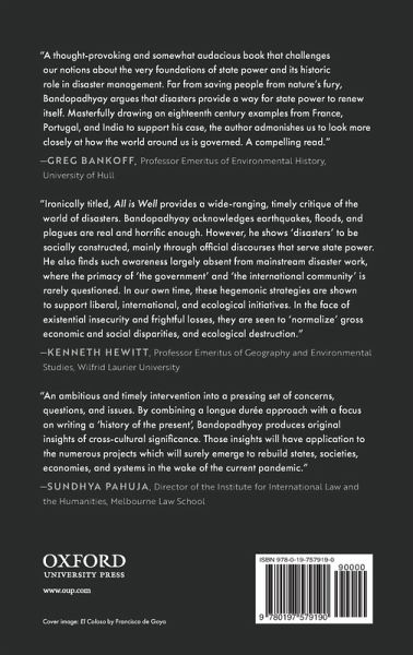 Disasters are all around us. In everyday parlance, disasters are understood as exceptional occurrences that destroy human life, property, and resources. For centuries, people have looked to political authorities for protection from disasters and for relief in the aftermath. Yet, the COVID-19 pandemic and an endless torrent of storms, floods, and forest fires have shown that modern states and intergovernmental institutions frequently fail this burden. Worse, world leaders routinely ignore evidence that accelerated climate change is an already-rolling planetary catastrophe. So, what is a disaster? Who determines when and why a disaster has occurred or ceased? And what is the relationship between such occurrences and modern states who promise to manage them? In All Is Well, Saptarishi Bandopadhyay argues that there is no such thing as a disaster outside of rituals of legal, administrative, and scientific contestation through which such occurrences are morally distinguished from the rhythms of everyday life. Disasters, Bandopadhyay asserts, are artifacts of normal rule. They result from the same, mundane strategies of knowledge-making and violence by which authorities, experts, and lay people struggle to develop state-like power, to define and defend the social order. Challenging traditional narratives, All Is Well looks at disaster management as a historical process that produces both catastrophes and political authorities. To do so, Bandopadhyay draws on three case studies: the Marseille plague of 1720, the Lisbon earthquake of 1755, and the Bengal famine of 1770. As far back as the eighteenth century, aspiring rulers understood disasters to be occasions for testing their state-like ambitions as they swapped divine authority for the supremacy of natural rights, Enlightenment ideals, and colonial rule. Bandopadhyay examines these exercises in catastrophe conservation and state formation and shows how the underlying beliefs and resulting insights underwrite sophisticated but deeply inequitable present-day norms and practices of global governance. He concludes that climate change, and the national and international authorities designed to fight it, are products of three centuries of disaster management, and civilizational survival depends on reckoning with this past.