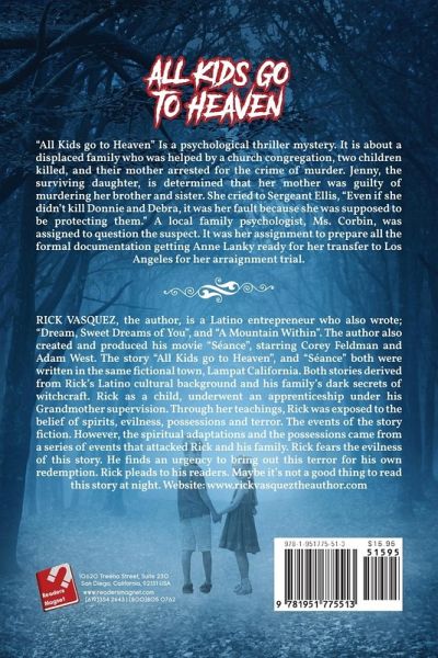 "All Kids go to Heaven" Is a psychological thriller mystery. It is about a displaced family who was helped by a church congregation, two children killed, and their mother arrested for the crime of murder. Jenny, the surviving daughter, is determined that her mother was guilty of murdering her brother and sister. She cried to Sergeant Ellis, "Even if she didn't kill Donnie and Debra, it was her fault because she was supposed to be protecting them." A local family psychologist, Ms. Corbin, was assigned to question the suspect. It was her assignment to prepare all the formal documentation getting Anne Lanky ready for her transfer to Los Angeles for her arraignment trial.