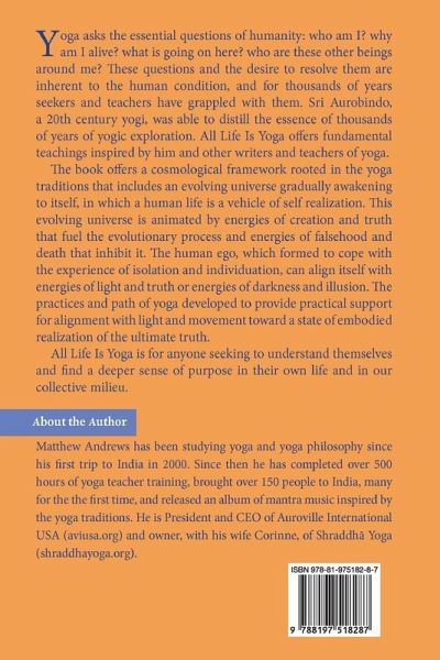 Yoga asks the essential questions of humanity: who am I? why am I alive? what is going on here? who are these other beings around me? These questions and the desire to resolve them are inherent to the human condition, and for thousands of years seekers and teachers have grappled with them. Sri Aurobindo, a 20th century yogi, was able to distill the essence of thousands of years of yogic exploration. All Life Is Yoga offers fundamental teachings inspired by him and other writers and teachers of yoga. The book offers a cosmological framework rooted in the yoga traditions that includes an evolving universe gradually awakening to itself, in which a human life is a vehicle of self realization. This evolving universe is animated by energies of creation and truth that fuel the evolutionary process and energies of falsehood and death that inhibit it. The human ego, which formed to cope with the experience of isolation and individuation, can align itself with energies of light and truth or energies of darkness and illusion. The practices and path of yoga developed to provide practical support for alignment with light and movement toward a state of embodied realization of the ultimate truth. All Life Is Yoga is for anyone seeking to understand themselves and find a deeper sense of purpose in their own life and in our collective milieu.