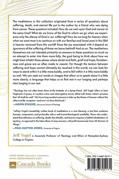 The meditations in this collection originated from a series of questions about suffering, death, and eternal life put to the author by a friend who was dying from cancer. These questions included: How do we wait upon God and cancer at the same time? What do we know of the God to whom we go when we experience only the silence of God in our suffering? How do we long for heaven when what we want most is to continue on with our families and loved ones in this life? Is heaven removed from this world? Does the joy associated with it depend on ignorance of the suffering of those we leave behind? And so on. The meditations themselves are not intended primarily as answers to these questions so much as an attempt to enter into them more fully, the goal being to think about how we might best inhabit those places where doubt and faith, grief and hope, forsakenness and grace are so often made to coexist. For though the tension between suffering and hope cannot ultimately be resolved in this world, we can look for ways to stand within it a little more boldly, and to fall within it a little more boldly as well. We can seek out words or images that allow us to speak about it a little more clearly, a language that helps us to find rest in our longing and perhaps also longing in our rest.