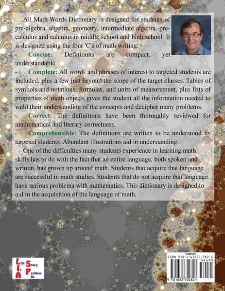 All Math Words Dictionary is designed for students of pre-algebra, algebra, geometry, intermediate algebra, pre-calculus and calculus in middle school and high school. It is designed using the four 'C's of math writing:Concise: Definitions are compact, yet understandable. Complete: All words and phrases of interest to targeted students are included, plus a few just beyond the scope of the target classes. Correct: The definitions have been thoroughly reviewed for mathematical and literary correctness. Comprehensible: The definitions are written to be understood by targeted students. Abundant illustrations aid in understanding. One of the difficulties many students experience in learning math skills has to do with the fact that an entire language, both spoken and written, has grown up around math. Students that acquire that language are successful in math studies. Students that do not acquire that language have serious problems with mathematics. This dictionary is designed to aid in the acquisition of the language of math. This dictionary has:over 3600 entries, more than 200 notations defined, in excess of 1300 illustrations, IPA pronunciation guide, greater than 1400 formulas, equations, examples, identities and expressions. While teaching high school math, the author, David E. McAdams, noted that some students did not understand even simple math statements, such as "This equation is determinate." Those students who had not acquired a basic math vocabulary were left behind, becoming frustrated and mentally dropping out of class. This dictionary was carefully crafted. The result of this extensive effort is All Math Words Dictionary, an important tool for math teachers and students. This book is available in four different editions:Color Classroom edition - typeset in 14-point Times New Roman font and with larger color illustrations. Best for any use, as the use of color guides the student through the illustrations. Available in paperback and hardback. Home edition - typeset in 10-point Times New Roman for home use. Available in color and black and white, both paperback. Large Print edition - typeset in 16 point Tiresias LP font for visually challenged students. Includes larger black and white illustrations. Available in paperback and hardback. Dyslexic edition - typeset in Open Dyslexic and Eulexia fonts with black and white illustrations. Available in paperback and hardback. If budget allows, Mr. McAdams highly recommends either the Color Classroom edition, or the Color Home edition. These editions show the part of the diagram being defined in red, allowing the student to more quickly understand the words being defined.