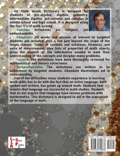 All Math Words Dictionary is designed for students of pre-algebra, algebra, geometry, intermediate algebra, pre-calculus and calculus in middle school and high school. It is designed using the four 'C's of math writing:Concise: Definitions are compact, yet understandable. Complete: All words and phrases of interest to targeted students are included, plus a few just beyond the scope of the target classes. Correct: The definitions have been thoroughly reviewed for mathematical and literary correctness. Comprehensible: The definitions are written to be understood by targeted students. Abundant…mehr