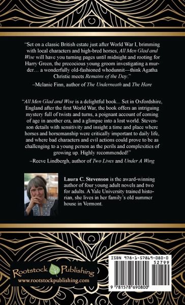 2023 Global Book Awards Finalist (Historical Fiction) 2022 Foreword INDIES Finalist (Mystery-Adult Fiction) 2022 IPNE Finalist (Genre Fiction) The steward of Willingford Hall was murdered in the Dell on 12 March 1919. I found his body because I'd been thrown by a horse. It's difficult to say which event was more unlikely. Willingford Hall stable lad Harry Green is about to make a discovery even more unlikely than a corpse. With the estate near bankruptcy and the rise of automobiles fast replacing horse travel, Harry, a young woman passing as a lad, will soon be out of a job. Facing the knowledge she has no skills in the service positions open to women, Harry resolves to discover who murdered the steward, thus becoming a woman who can determine her own future. But as her investigation proceeds, a second murder demonstrates just how dangerous her knowledge is. Soon, no matter where she rides, she finds that somebody is following her. Part coming-of-age and part cozy mystery, All Men Glad and Wise confronts a time of tremendous social change: the inequities of service jobs, the quandaries of grooms as technology advances, and the patriarchal assumptions that exclude women from both valued work and riding astride. Harry, like horsemanship, and like England, is on the cusp of a world looking forward.