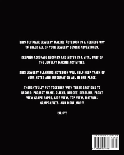 How to use this Jewelry Making Notebook: 8 X 10 Inches 110 Pages This useful jewelry project log book is a must-have for anyone that loves the art of designing jewelry! You will love this easy to use journal to track and record all your architecture activities. Each interior page includes space to record & track the following: Project Name - Write down the name of the current project. Date - Use this space to fill in the date of the project. Clients - Record and Track the client's name. Budget - Fill in the allowed budget for this project. Deadline - Write out the deadline for the project. Dimensions - Stay on task using the grid graph to sketch out the front, side and top view of the piece of jewelry. Material Components - Write out the details of each material, weight, quantity and the price. If you are new to the world of making jewelry or have been at it for a while, this jewelry making planner is a must have! Can make a great useful gift for anyone that loves to make jewelry! Have Fun!