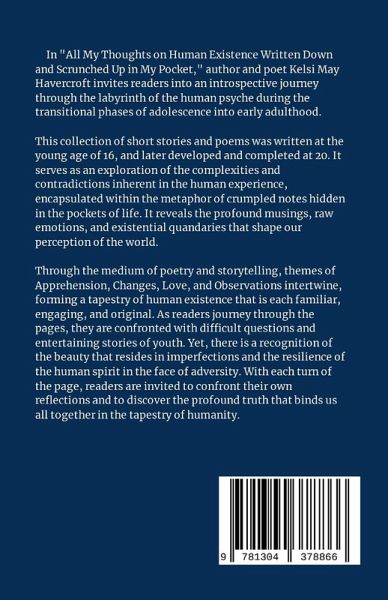 "All My Thoughts on Human Existence Written Down and Scrunched Up in My Pocket," written by Kelsi May Havercroft tackles the reality and understanding of navigating the different phases of early adulthood. In this short story poetry collection, Havercroft conveys themes of Apprehension, Changes, Love, and Observations that she believes impact all individuals daily. These themes are constantly working on artists and creatives in their everyday lives sometimes making it challenging to persist or make sense of it all. Unraveling this large tapestry of the shared individual human experience makes life a little less overwhelming. It demonstrates to readers to take their time admiring the beauty in and around them.