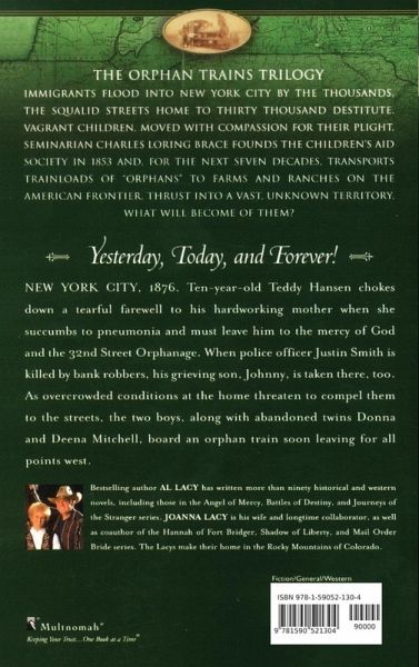 The second book in the Orphan Trains Trilogy from writing duo Al and Joanna Lacy When 62 orphans and abandoned children leave New York City on a train headed out West, they have no idea what to expect. Will they get separated from their friends or siblings? Will their new families love them? Will a family even pick them at all? But their futures are wilder than any of them could imagine, and range from kidnappings and whippings to stowing away on wagon trains, from starting orphanages of their own to serving as missionaries to the Apaches. No matter what, their paths are being watched by someone who cares about--and carefully plans--all of their tomorrows.