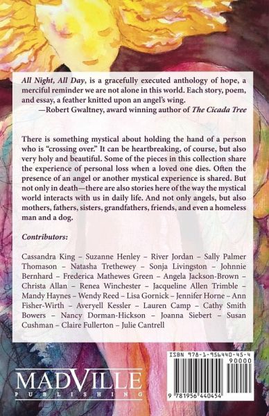 All Night, All Day is an inspirational collection of personal essays, stories, and poems by outstanding women authors who write about the appearance of the divine in their lives. Some of these angels come to save a life or change a flat tire. Some appear to warn people, tell them what to do, suggest more vegetables and maybe better shoes. Contributors:Cassandra King - Suzanne Henley - River Jordan - Sally Palmer Thomason - Natasha Trethewey - Sonja Livingston - Johnnie Bernhard - Frederica Mathewes-Green - Angela Jackson-Brown - Christa Allan - Renea Winchester - Jacqueline Allen Trimble - Mandy Haynes - Wendy Reed - Lisa Gornick - Jennifer Horne - Ann Fisher-Wirth - Averyell Kessler - Lauren Camp - Cathy Smith Bowers - Nancy Dorman-Hickson - Joanna Siebert - Susan Cushman - Claire Fullerton - Julie Cantrell