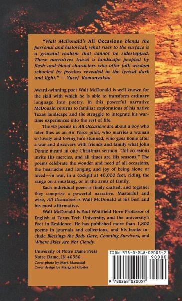 Award-winning poet Walt McDonald is well known for the skill with which he is able to transform ordinary language into poetry. In this, his eighteenth volume of poetry, McDonald returns to familiar explorations of his native Texas landscape and the struggle to integrate wartime experiences into the rest of life. The 65 poems in All Occasions are about a boy who later flies as an Air Force pilot, who marries a woman so lovely and loving he's stunned, who goes home after a war and discovers with friends and family what John Donne meant in one Christmas sermon: "All occasions invite His mercies, and all times are His seasons." The poems celebrate the wonder and need of all occasions, the heartache and longing and joy of being alone or loved-in war, in a cockpit at 40,000 feet, riding the range on a mustang, or in the arms of family. In "Carrion Comfort," Gerard Manley Hopkins wrote about "That night, that year / of now done darkness I wretch lay wrestling with (my God!) / my God." In Part 2 of All Occasions, McDonald experiences that struggle in Vietnam and discovers over swift decades how deeply he needs friends, family, and God. Each individual poem is finely crafted, and together they comprise a powerful narrative. Masterful and wise, All Occasions is Walt McDonald at his best and his most affirmative.