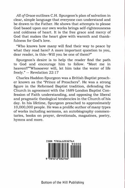 All of Grace outlines C.H. Spurgeon's plan of salvation in clear, simple language that everyone can understand and be drawn to the Father. He shows that attempts to please God based upon our own works brings self-righteousness and coldness of heart. It is the free grace and mercy of God that makes the heart glow with warmth and thankfulness for God's love. "Who knows how many will find their way to peace by what they read here? A more important question to you, dear reader, is this--Will you be one of them?" Spurgeon's desire is to help the reader find the path to God and encourage him to follow. "Meet me in heaven!!""Whosoever will, let him take the water of life freely." -- Revelation 22:17 Charles Haddon Spurgeon was a British Baptist preacher known as the "Prince of Preachers". He was a strong figure in the Reformed Baptist tradition, defending the Church in agreement with the 1689 London Baptist Confession of Faith understanding, and opposing the liberal and pragmatic theological tendencies in the Church of his day. In his lifetime, Spurgeon preached to approximatelly 10,000,000 people. He was a prolific author of many types of works including sermons, an autobiography, commentaries, books on prayer, devotionals, magazines, poetry, hymns and more.