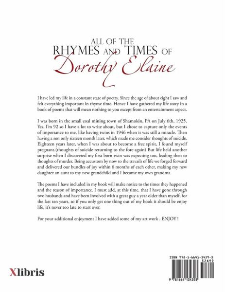 I have led my life in a constant state of poetry. Since the age of about eight I saw and felt everything important in rhyme time. Hence I have gathered my life story in a book of poems that will mean nothing to you except from an entertainment aspect. I was born in the small coal mining town of Shamokin, PA on July 6th, 1925 . Yes, I'm 92 so I have a lot to write about, but I chose to capture only the events of importance to me, like having twins in 1946 when it was still a miracle. Then having a son only sixteen month later, which made me consider thoughts of suicide. Eighteen years later, when I was about to become a free spirit, I found myself pregnant.(thoughts of suicide returning to the fore again) But life held another surprise when I discovered my first born twin was expecting too, leading then to thoughts of murder. Being accustom by now to the travails of life we forged forward and delivered our bundles of joy within 6 months of each other, making my new daughter an aunt to my new grandchild and I became my own grandma. The poems I have included in my book will make notice to the times they happened and the reason of importance. I must add, at this time, that I have gone through two husbands and have been involved with a great guy a year older than myself, for the last ten years, so if you only get one thing out of my book it should be enjoy life, it's never too late to start over. For your additional enjoyment I have added some of my art work . ENJOY !