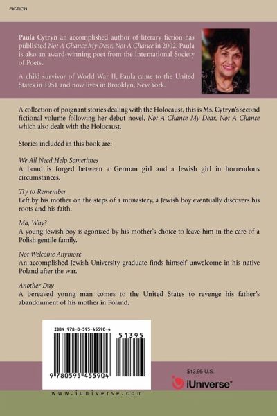 A collection of poignant stories dealing with the Holocaust, this is Ms. Cytryn's second fictional volume following her debut novel, Not A Chance My Dear, Not A Chance which also dealt with the Holocaust. Stories included in this book include: We All Need Help Sometimes A bond is forged between a German girl and a Jewish girl in horrendous circumstances. Try to Remember Left by his mother on the steps of a monastery, a Jewish boy eventually discovers his roots and his faith. Ma, Why? A young Jewish boy who, alone of all his siblings, is left in the care of a Gentile Polish family by his mother. Not Welcome Anymore An accomplished Jewish University graduate finds himself unwelcome in his native Poland after the war. Another Day A bereaved young man comes to the United States to revenge his father's abandonment of his mother in Poland.