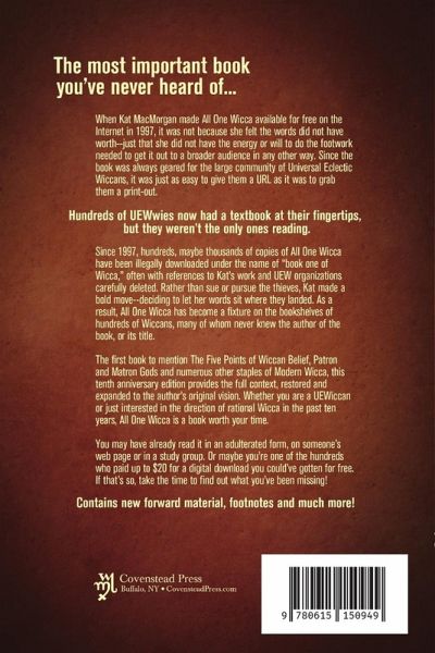 The most important book on Wicca you've never heard of... Created to serve the rapidly growing Universal Eclectic Wiccan audience, All One Wicca was first released for free onto the 'net in 1997. Since then, thousands of adulterated illegal downloads of the document have been distributed, often under the title "book one of Wicca." These copies were usually edited to remove references to the author and her tradition or had materials added from other unlucky authors. Rather than pursue or sue the thieves, AOW's author made a bold decision-let the words sit where they landed and find the people they were meant for. Since then, AOW has become a staple on many Wiccan bookshelves, despite many of its most ardent fans not knowing the source of the material, or even the author's name. Covenstead Press is honored to reprint the first book to mention the concepts of Patron gods, elemental visualization and The Five Points of Wiccan belief in this new edition, revised to the author's original vision.