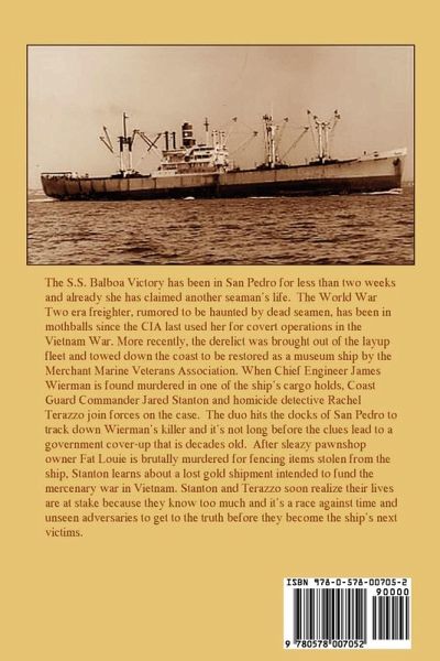 The S.S. Balboa Victory has been in San Pedro for less than two weeks and already she has claimed another seaman's life. The World War Two era freighter, rumored to be haunted by dead seamen, has been in mothballs since the CIA last used her for covert operations in the Vietnam War. When Chief Engineer James Wierman is found murdered in one of the ship's cargo holds, Coast Guard Commander Jared Stanton and homicide detective Rachel Terazzo join forces on the case. The duo hits the docks of San Pedro to track down Wierman's killer and it's not long before the clues lead to a government cover-up that is decades old. Stanton learns about a lost gold shipment intended to fund the mercenary war in Vietnam. Stanton and Terazzo soon realize their lives are at stake because they know too much and it's a race against time and unseen adversaries to get to the truth before they become the ship's next victims.