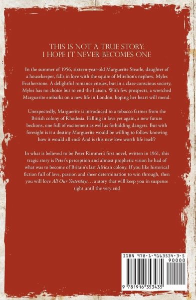 This is not a true story; I hope it never becomes one. In the summer of 1956, sixteen-year-old Marguerite Stearle, daughter of a housekeeper, falls in love with the squire of Mirelton's nephew, Myles Featherstone. A delightful romance ensues, but in a class-conscious society, Myles has no choice but to end the liaison. With few prospects, a wretched Marguerite embarks on a new life in London, hoping her heart will mend. Unexpectedly, Marguerite is introduced to a tobacco farmer from the British colony of Rhodesia. Falling in love yet again, a new future beckons, one full of excitement as well as forbidding dangers. But with foresight is it a destiny Marguerite would be willing to follow knowing how it would all end? And is this new love worth life itself? In what is believed to be Peter Rimmer's first novel, written in 1961, this tragic story is Peter's perception and almost prophetic vision he had of what was to become of Britain's last African colony. If you like historical fiction full of love, passion and sheer determination to win through, then you will love All Our Yesterdays…a story that will keep you in suspense right until the very end.