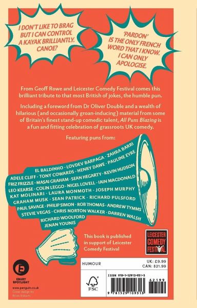 I don't like to brag but I can control a kayak brilliantly. Canoe?'Pardon' is the only French word that I know. I can only apologise. From Geoff Rowe and the Leicester Comedy Festival comes this brilliant tribute to that most British of jokes, the humble pun. Including a foreword from Dr Oliver Double and a wealth of hilarious (and occasionally groan-inducing) material from some of Britain's finest stand-up comedic talent, All Puns Blazing is a fun and fitting celebration of grassroots UK comedy. Featuring puns from:El Baldiniho - Lovdev Barpaga - Zahra Barri - Adele Cliff - Tony Cowards - Henry Dawe - Pauline Eyre - Friz Frizzle - Masai Graham - Sean Hegarty - Kevin Hudson - Leo Kearse - Colin Leggo - Nigel Lovell - Iain MacDonald - Kat Molinari - Laura Monmoth - Joseph Murphy - Graham Musk - Sean Patrick - Richard Pulsford - Paul Savage - Philip Simon - Rob Thomas - Andrew Tymms - Stevie Vegas - Chris Norton Walker - Darren Walsh - Richard Woolford - Jenan Younis