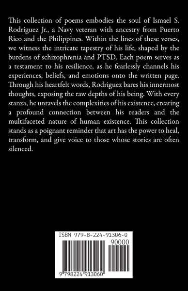 This collection of poems embodies the soul of Ismael S. Rodriguez Jr., a Navy veteran with ancestry from Puerto Rico and the Philippines. Within the lines of these verses, we witness the intricate tapestry of his life, shaped by the burdens of schizophrenia and PTSD. Each poem serves as a testament to his resilience, as he fearlessly channels his experiences, beliefs, and emotions onto the written page. Through his heartfelt words, Rodriguez bares his innermost thoughts, exposing the raw depths of his being. With every stanza, he unravels the complexities of his existence, creating a profound connection between his readers and the multifaceted nature of human existence. This collection stands as a poignant reminder that art has the power to heal, transform, and give voice to those whose stories are often silenced.