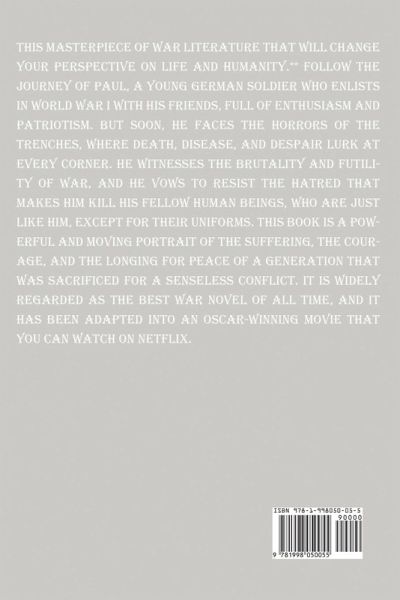 This masterpiece of war literature that will change your perspective on life and humanity.** Follow the journey of Paul, a young German soldier who enlists in World War I with his friends, full of enthusiasm and patriotism. But soon, he faces the horrors of the trenches, where death, disease, and despair lurk at every corner. He witnesses the brutality and futility of war, and he vows to resist the hatred that makes him kill his fellow human beings, who are just like him, except for their uniforms. This book is a powerful and moving portrait of the suffering, the courage, and the longing for peace of a generation that was sacrificed for a senseless conflict. It is widely regarded as the best war novel of all time, and it has been adapted into an Oscar-winning movie that you can watch on Netflix.