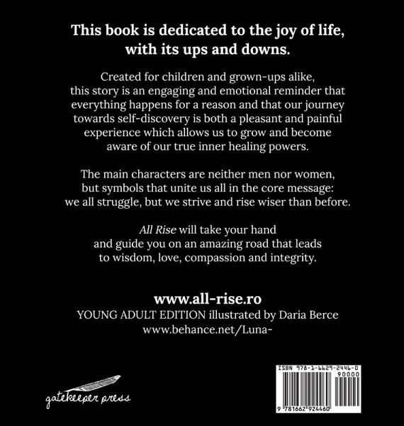 This book is dedicated to the joy of life, with its ups and downs. Created for children and grown-ups alike, this story is an engaging and emotional reminder that everything happens for a reason and that our journey towards self-discovery is both a pleasant and painful experience which allows us to grow and become aware of our true inner healing powers. The main characters are neither men nor women, but symbols that unite us all in the core message: we all struggle, but we strive and rise wiser than before. All Rise will take your hand and guide you on an amazing road that leads to wisdom, love, compassion and integrity. This book is part of a set of five books illustrated by five different artists, around the same text.