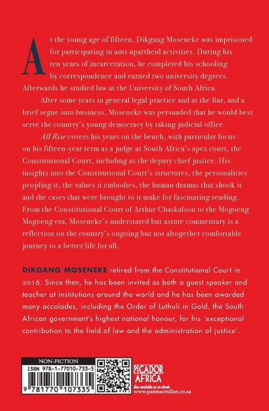 At the young age of fifteen, Dikgang Moseneke was imprisoned for participating in anti-apartheid activities. During his ten years of incarceration, he completed his schooling by correspondence and earned two university degrees. Afterwards he studied law at the University of South Africa. After some years in general legal practice and at the Bar, and a brief segue into business, Moseneke was persuaded that he would best serve the country's young democracy by taking judicial office. All Rise covers his years on the bench, with particular focus on his fifteen-year term as a judge at South Africa's apex court, the Constitutional Court, including as the deputy chief justice. His insights into the Constitutional Court's structures, the personalities peopling it, the values it embodies, the human dramas that shook it and the cases that were brought to it make for fascinating reading. From the Constitutional Court of Arthur Chaskalson to the Mogoeng Mogoeng era, Moseneke's understated but astute commentary is a reflection on the country's ongoing but not altogether comfortable journey to a better life for all.