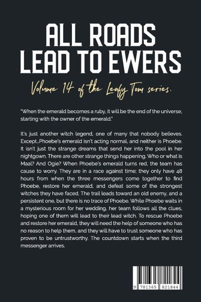 Volume 14 of the Leafy Tom series "When the emerald becomes a ruby, it will be the end of the universe, starting with the owner of the emerald." It's just another witch legend, one of many that nobody believes. Except...Phoebe's emerald isn't acting normal, and neither is Phoebe. It isn't just the strange dreams that send her into the pool in her nightgown. There are other strange things happening. Who or what is Maal? And Ogie? When Phoebe's emerald turns red, the team has cause to worry. They are in a race against time; they only have 48 hours from when the three messengers come together to find Phoebe, restore her emerald, and defeat some of the strongest witches they have faced. The trail leads toward an old enemy, and a persistent one, but there is no trace of Phoebe. While Phoebe waits in a mysterious room for her wedding, her team follows all the clues, hoping one of them will lead to their lead witch. To rescue Phoebe and restore her emerald, they will need the help of someone who has no reason to help them, and they will have to trust someone who has proven to be untrustworthy. The countdown starts when the third messenger arrives.