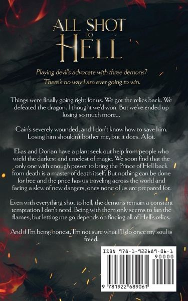 Playing devil's advocate with three demons? There's no way I am ever going to win. Things were finally going right for us. We got the relics back. We defeated the dragon. I thought we'd won. But we've ended up losing so much more... Cain's severely wounded, and I don't know how to save him. Losing him shouldn't bother me, but it does. A lot. Elias and Dorian have a plan: seek out help from people who wield the darkest and cruelest of magic. We soon find that the only one with enough power to bring the Prince of Hell back from death is a master of death itself. But nothing can be done for free and the price has us traveling across the world and facing a slew of new dangers, ones none of us are prepared for. Even with everything shot to hell, the demons remain a constant temptation I don't need. Being with them only seems to fan the flames, but letting me go depends on finding all of Hell's relics. And if I'm being honest, I'm not sure what I'll do once my soul is freed. SIN DEMONS Series Playing With Hellfire Hell In A Handbasket All Shot To Hell To Hell And Back When Hell Freezes Over Hell On Earth