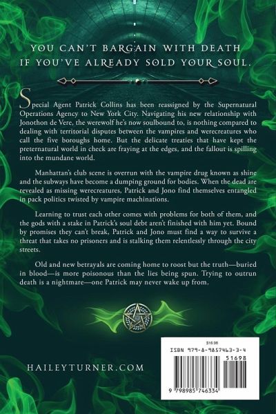 You can't bargain with death if you've already sold your soul. Special Agent Patrick Collins has been reassigned by the Supernatural Operations Agency to New York City. Navigating his new relationship with Jonothon de Vere, the werewolf he's now soulbound to, is nothing compared to dealing with territorial disputes between the vampires and werecreatures who call the five boroughs home. But the delicate treaties that have kept the preternatural world in check are fraying at the edges, and the fallout is spilling into the mundane world. Manhattan's club scene is overrun with the vampire drug known as shine and the subways have become a dumping ground for bodies. When the dead are revealed as missing werecreatures, Patrick and Jono find themselves entangled in pack politics twisted by vampire machinations. Learning to trust each other comes with problems for both of them, and the gods with a stake in Patrick's soul debt aren't finished with him yet. Bound by promises they can't break, Patrick and Jono must find a way to survive a threat that takes no prisoners and is stalking them relentlessly through the city streets. Old and new betrayals are coming home to roost but the truth-buried in blood-is more poisonous than the lies being spun. Trying to outrun death is a nightmare-one Patrick may never wake up from.