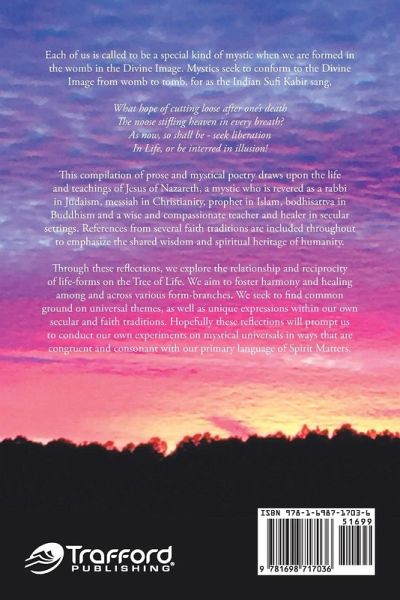 Each of us is called to be a special kind of mystic when we are formed in the womb in the Divine Image. Mystics seek to conform to the Divine Image from womb to tomb, for as the Indian Sufi Kabir sang, What hope of cutting loose after one's death The noose stifling heaven in every breath? As now, so shall be - seek liberation In Life, or be interred in illusion! This compilation of prose and mystical poetry draws upon the life and teachings of Jesus of Nazareth, a mystic who is revered as a rabbi in Judaism, messiah in Christianity, prophet in Islam, bodhisattva in Buddhism and a wise and compassionate teacher and healer in secular settings. References from several faith traditions are included throughout to emphasize the shared wisdom and spiritual heritage of humanity. Through these reflections, we explore the relationship and reciprocity of life-forms on the Tree of Life. We aim to foster harmony and healing among and across various form-branches. We seek to find common ground on universal themes, as well as unique expressions within our own secular and faith traditions. Hopefully these reflections will prompt us to conduct our own experiments on mystical universals in ways that are congruent and consonant with our primary language of Spirit Matters.