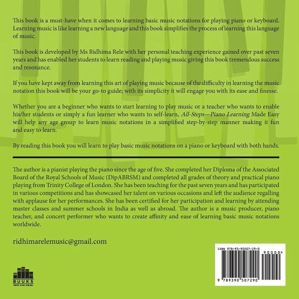 About the Book This book is a must-have when it comes to learning basic music notations for playing piano or keyboard. Learning music is like learning a new language and this book simplifies the process of learning this language of music. This book is developed by Ms Ridhima Rele with her personal teaching experience gained over past seven years and has enabled her students to learn reading and playing music giving this book tremendous success and resonance. If you have kept away from learning this art of playing music because of the difficulty in learning the music notation this book will be your go-to guide; with its simplicity it will engage you with its ease and finesse. Whether you are a beginner who wants to start learning to play music or a teacher who wants to enable his/her students or simply a fun learner who wants to self-learn, All-Steps-Piano Learning Made Easy will help any age group to learn music notations in a simplified step-by-step manner making it fun and easy to learn. By reading this book you will learn to play basic music notations on a piano or keyboard with both hands. About the Author The author is a pianist playing the piano since the age of five. She completed her Diploma of the Associated Board of the Royal Schools of Music (DipABRSM) and completed all grades of theory and practical piano playing from Trinity College of London. She has been teaching for the past seven years and has participated in various competitions and has showcased her talent on various occasions and left the audience regalling with applause for her performances. She has been certified for her participation and learning by attending master classes and summer schools in India as well as abroad. The author is a music producer, piano teacher, and concert performer who wants to create affinity and ease of learning basic music notations worldwide. ridhimarelemusic@gmail.com