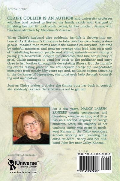 CLAIRE COLLIER IS AN AUTHOR and university professor who has just retired to live on the family ranch with the goal of finishing her fourth book while caring for her brother, James, who has been stricken by Alzheimer's disease. When Claire's husband dies suddenly, her life is thrown into upheaval. As Alzheimer's threatens to take over her own brain, a dangerous, masked man moves about the Kansas countryside, haunted by painful memories and pent-up revenge that lead him on a path of brutalizing innocent people and killing animals-even raping a young girl. Meanwhile, despite the obstacles that line her journey of grief, Claire manages to send her book to the publisher and stays close to her brother through his devastating illness. But the horrifying events taking place in the countryside dredge up unspeakable memories from nearly fifty years ago and, as Claire begins drowning in the darkness of depression, she must seek help through counseling and medication. Just as Claire makes a choice she thinks puts her back in control, she suddenly realizes the attacker is out to get her.