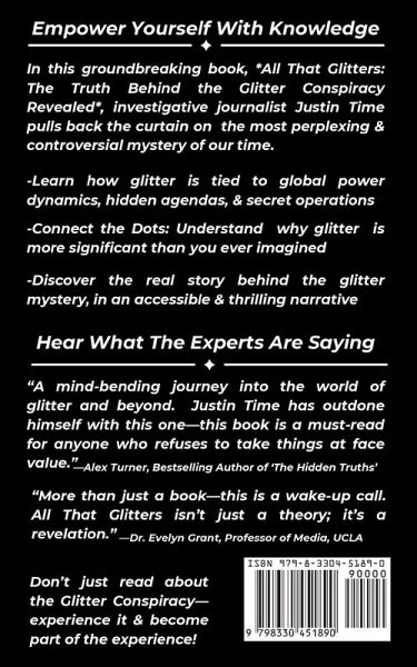 All That Glitters: The Truth Behind the Glitter Conspiracy Revealed Step inside the hidden world of secret discoveries and conspiracy theories with *All That Glitters*. Investigative journalist Justin Time uncovers one of the most fascinating hidden truths of our time-the secret story of glitter. This captivating book pulls back the curtain on the industrial secrets and hidden agendas that have kept glitter's true purpose under wraps, revealing how a seemingly innocent material holds surprising power and influence. Discover the truth behind the unseen forces shaping our world From behind-the-scenes operations to the unseen impact of glitter in unexpected industries, this eye-opening investigation dives deep into a mystery that conspiracy theorists have speculated about for years. *All That Glitters* unravels the secret world of glitter, exposing hidden forces at play in ways that will change how you think about this everyday material. Justin Time's in-depth research and compelling storytelling reveal the truth behind the curtain, showing how what seems like a simple material is actually at the heart of secret industries and untold stories. This book provides an insider's look into the shadowy side of materials science and the hidden history of a global phenomenon. If you're intrigued by unsolved mysteries, eye-opening revelations, or just love a great behind-the-scenes expose, *All That Glitters* is a must-read. Dive into the hidden world and uncover the secrets they don't want you to know.