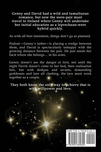 Genny and David had a wild and tumultuous romance, but now the were-pair must travel to Ireland where Genny will undertake her initial education as a leprechaun-were hybrid quickly. As with all best intentions, things don't go as planned. Padraic-Genny's father-is placing a wedge between them, and David is spectacularly unhappy with the growing distance between the pair. He just needs her back where she belongs... in his arms. Genny doesn't see the danger at first, not until the night David doesn't come to her bed, then realisation hits, but with demons and secrets, demanding goddesses and lore all clashing, the two must work together as a couple. They both know the only way to achieve that is with willpower and love.
