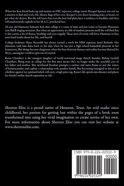 When her best friend lucks up and marries an NFL superstar, college senior Racquel Spencer sets out on a mission to find and wed a Mr. Money Bags of her own. Racquel is not above breaking rules, or hearts, to get what she desires. But she will learn that even the best laid plans have a tendency to backfire, and they will inadvertently explode in her M.A.C. powdered face. 18-year old Harmony Eubanks feels that college is a waste of time and just wants to become Houston's next R&B singing sensation. But when an opportunity at a life of stardom presents itself she will find that it also carries a lot of drama, hardship and even tragedy. These turn of events will force Harmony to face some hard truths about her life...and herself. College freshman Skyye Reynolds has always carried a torch for NBA superstar Jarad Rolands. Her obsession with him dates back to the days when he was just a high school basketball phenom in her hometown. But things become dangerous when the lines between fantasy and reality become blurred for Skyye, causing her world to spin out of control. Raine Chambers is the youngest daughter of world renowned mega church founder, Bishop Lyndall Chambers. Being away at college for the first time means she's no longer under the watchful eyes of her father and mother. This newfound freedom prompts a curious and naïve Raine to test the waters of homosexuality and explore a relationship with another female. But becoming entangled in this act of rebellion against her spiritual beliefs will carry a high price tag. Raine's life spirals into disaster and places her family's stellar church reputation at risk.