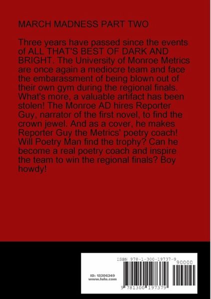It is three years after the events of ALL THAT's BEST OF DARK AND BRIGHT. The University of Monroe Metrics are again a mediocre club. This year, though, the Beast, the Northeast regional championship, is being held at Monroe. They face the embarrassment of being blown out of their own arena. What's more, a valuable artifact has been stolen! The Monroe AD hires Reporter Guy, narrator of the earlier book, to find the crown jewel. And as a cover, he makes Reporter Guy the Metrics' poetry coach! Will Poetry Man find the trophy? Will he discover unknown skills as a poetry coach to motivate the team? Boy howdy!