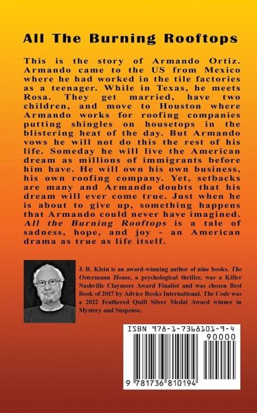 This is the story of Armando Ortiz. Armando came to the US from Mexico where he had worked in the tile factories as a teenager. While in Texas, he meets Rosa. They get married, have two children, and move to Houston where Armando works for roofing companies putting shingles on housetops in the blistering heat of the day. But Armando vows he will not do this the rest of his life. Someday he will live the American Dream as millions of immigrants before him have done. He will own his own business, his own roofing company. Yet, setbacks are many and Armando doubts that his dream will ever come true. Just when he is about to give up, something happens that Armando could never have imagined. All the Burning Rooftops is a tale of sadness, hope, and joy-an American drama as true as life itself.