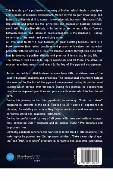 The author learned his initial business acumen from P&G, considered one of the best in business coaching and practices. This educational attainment helped him reach the top of the pyramid of management during his professional journey which spread over 40 years. During this journey, he experienced business management practices and processes with values that he has shared here.During this journey, he had the opportunity to undergo "Train the trainer" programs by experts in the field. This led to 35 + years of experience in planning, formulating, and conducting training workshops and seminars in the corporate world and academic institutions. During the professional journey of 40 years with three multinational companies, conducted 200 + programs and influenced 3000 + Professionals and Employees' lives. Currently conducts seminars and workshops in the field of life coaching. The main topics he pursues are 'Entrepreneur mindset', 'Taking ownership of your life, and ''MBA in 18 hours' programs in corporate and academic institutions.