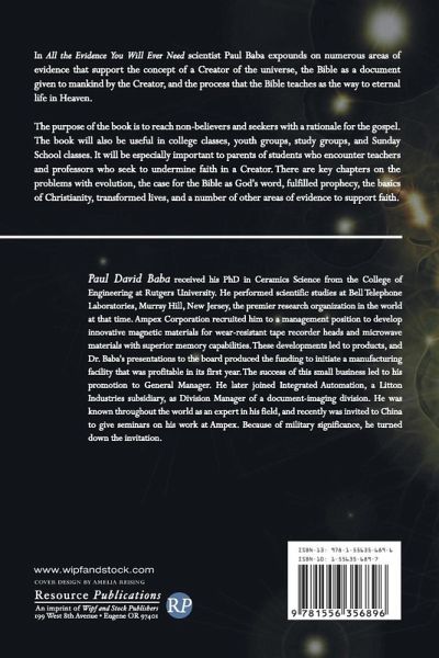 In All the Evidence You Will Ever Need scientist Paul Baba expounds on numerous areas of evidence that support the concept of a Creator of the universe, the Bible as a document given to mankind by the Creator, and the process that the Bible teaches as the way to eternal life in Heaven. The purpose of the book is to reach non-believers and seekers with a rationale for the gospel. The book will also be useful in college classes, youth groups, study groups, and Sunday School classes. It will be especially important to parents of students who encounter teachers and professors who seek to undermine faith in a Creator. There are key chapters on the problems with evolution, the case for the Bible as God's word, fulfilled prophecy, the basics of Christianity, transformed lives, and a number of other areas of evidence to support faith.
