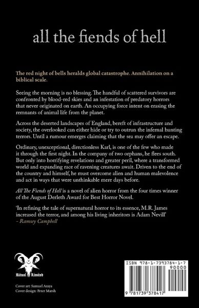 The red night of bells heralds global catastrophe. Annihilation on a biblical scale. Seeing the morning is no blessing. The handful of scattered survivors are confronted by blood-red skies and an infestation of predatory horrors that never originated on earth. An occupying force intent on erasing the remnants of animal life from the planet. Across the deserted landscapes of England, bereft of infrastructure and society, the overlooked can either hide or try to outrun the infernal hunting terrors. Until a rumour emerges claiming that the sea may offer an escape. Ordinary, unexceptional, directionless Karl, is one of the few who made it through the first night. In the company of two orphans, he flees south. But only into horrifying revelations and greater peril, where a transformed world and expanding race of ravening creatures await. Driven to the end of the country and himself, he must overcome alien and human malevolence and act in ways that were unthinkable mere days before. All The Fiends of Hell is a novel of alien horror from the four times winner of the August Derleth Award for Best Horror Novel.