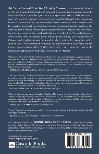 All the Fullness of God: The Christ of Colossians focuses on the Christology of Colossians and its implications by examining the canonical text and answering the questions: What was the author's purpose in writing the letter? What is the letter's primary concern? How do its contents reflect or deviate from Paul's thought in his uncontested letters? The author of Colossians is favorably disposed toward the letter's recipients who have received the gospel from Epaphras, but now encounter alternative teachings. The author finds that church's Christology inadequate and writes to expand their understanding of the meaning of baptism into Jesus Christ and its implications. This study introduces Greco-Roman letter and literary forms; the geography, history, and demographics of Colossae; and provides excurses on several scholarly matters. It is comprised of five chapters (Part I) which set forth the argument and explain the text in its historical context, followed by nine reflections (Part II) which place each text in its context, then elucidate the meaning and application of the passage for contemporary readers.