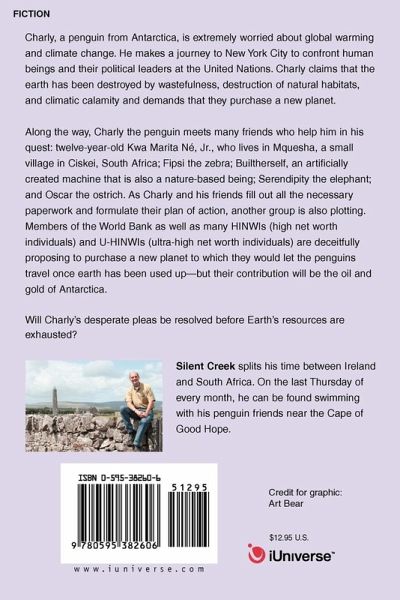 Charly, a penguin from Antarctica, is extremely worried about global warming and climate change. He makes a journey to New York City to confront human beings and their political leaders at the United Nations. Charly claims that the earth has been destroyed by wastefulness, destruction of natural habitats, and climatic calamity and demands that they purchase a new planet. Along the way, Charly the penguin meets many friends who help him in his quest: twelve-year-old Kwa Marita Né, Jr., who lives in Mquesha, a small village in Ciskei, South Africa; Fipsi the zebra; Builtherself, an artificially created machine that is also a nature-based being; Serendipity the elephant; and Oscar the ostrich. As Charly and his friends fill out all the necessary paperwork and formulate their plan of action, another group is also plotting. Members of the World Bank as well as many HINWIs (high net worth individuals) and U-HINWIs (ultra-high net worth individuals) are deceitfully proposing to purchase a new planet to which they would let the penguins travel once earth has been used up-but their contribution will be the oil and gold of Antarctica. Will Charly's desperate pleas be resolved before Earth's resources are exhausted?