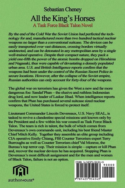 United States Navy SEAL Lincoln Devereaux leads a clandestine unit of Special Operators, CIA and FBI, code named Task Force Black Talon, on a mission to capture an Indonesian narco-terrorist named Sandaf Phan and prevent his terror network from detonating suitcase size nuclear weapons in Western metropolitan centers.
