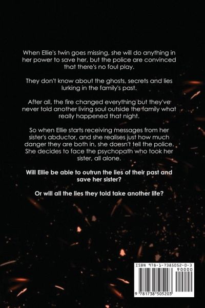 If your sister went missing and her abductor started sending you clues... what would you do? When Ellie's twin Freya goes missing, Ellie will do anything in her power to save her. But the police are convinced there's no foul play. They don't know about the ghosts, secrets and lies lurking in the family's past. After all, the fire changed everything but they've never told another living soul outside the family what really happened that night. So when Ellie starts receiving messages from her sister's abductor, and she realises just how much danger Freya is in, she doesn't tell the police. She decides to face them alone. Will Ellie be able to outrun the lies of their past and save her sister? Or will all the lies they told take another life?