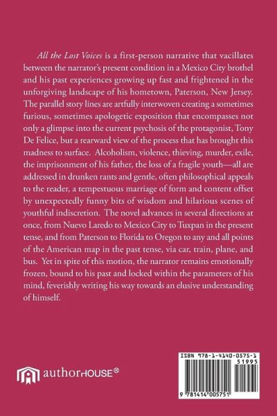 All the Lost Voices is a first-person narrative that vacillates between the narrator¿s present condition in a Mexico City brothel and his past experiences growing up fast and frightened in the unforgiving landscape of his hometown, Paterson, New Jersey. The parallel story lines are artfully interwoven creating a sometimes furious, sometimes apologetic exposition that encompasses not only a glimpse into the current psychosis of the protagonist, Tony De Felice, but a rearward view of the process that has brought this madness to surface. Alcoholism, violence, thieving, murder, exile, the imprisonment of his father, the loss of a fragile youth¿all are addressed in drunken rants and gentle, often philosophical appeals to the reader, a tempestuous marriage of form and content offset by unexpectedly funny bits of wisdom and hilarious scenes of youthful indiscretion. The novel advances in several directions at once, from Nuevo Laredo to Mexico City to Tuxpan in the present tense, and from Paterson to Florida to Oregon to any and all points of the American map in the past tense, via car, train, plane, and bus. Yet in spite of this motion, the narrator remains emotionally frozen, bound to his past and locked within the parameters of his mind, feverishly writing his way towards an elusive understanding of himself.