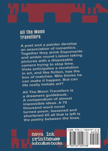A POET AND A PAINTER DEVELOP 'an association of romantics.' Together they drink Espumante and amble round Lisbon taking pictures with a disposable camera trying to "stop time." Viola anticipates a revolution in art, and like fiction, has the box of matches. Milo thinks he can "make it happen." But can life really imitate art?ALL THE MOON TRAVELLERS is a daydreamer's guidebook, a compendium of almost impossible ideas. A novel turned montage poem, lessened and shortened 'till all that is left is the poetry between the lines.