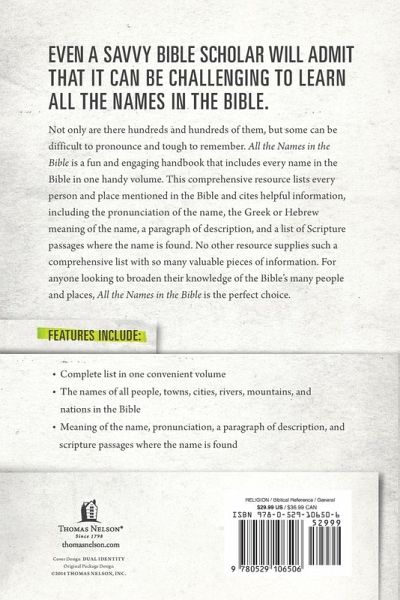 Even the most savvy Bible scholar will admit that it can be challenging to learn all the names in the Bible. Not only are there hundreds and hundreds of them, but some can be difficult to pronounce and tough to remember. All The Names in the Bible is a fun and engaging handbook that includes every name in the Bible in one handy volume. This comprehensive resource lists every person and place mentioned in the Bible and cites helpful information, including the pronunciation of the name, the Greek or Hebrew meaning of the name, a paragraph of description, and a list of Scripture passages where the name is found. No other resource supplies such a comprehensive list with so many valuable pieces of information. For anyone looking to broaden their knowledge of the Bible's many people and places, All the Names in the Bible is the perfect choice. Features include: * Complete list in one convenient volume * Includes the names of all people, towns, cities, rivers, mountains, and nations in the Bible * Meaning of the name, a paragraph of description, and Scripture passages where the name is found
